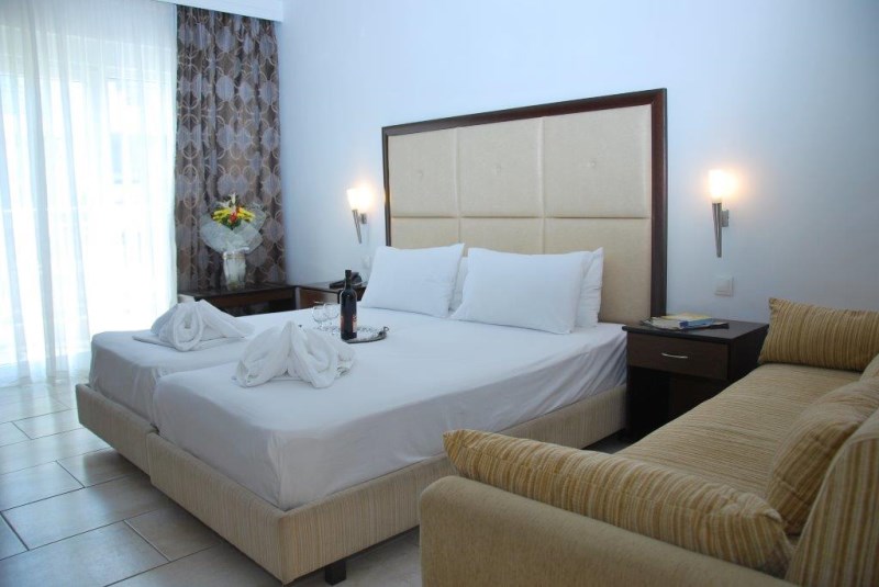 Naias je mali hotel koji se nalazi na samoj plaži u Haniotiju okružen zelenilom. Idealan je izbor za porodice sa decom jer ima sve prednosti modernog hotela ne zanemarujući udobnost i kvalitet usluge. Sastoji se iz dve zgrade - stare koja se nalazi na plaži i nove koja se nalazi preko puta. Lokacija hotelske plaže je na samom kraju gradske plaže, i krase je sitan pesak i biserno čista voda. Blizina centra Haniotija čini ga odličnim izborom kako za porodice tako i za mlade. Sadržaj hotela: otvoreni bazen, bazen za decu, restoran, bar kraj bazena, bar na plaži, wi-fi Internet u javnim delovima hotela (besplatno). Suncobrani i ležaljke oko bazena su uključeni u cenu, a na plaži se doplaćuju oko 6 eur (set: 2 ležaljke i suncobran). Sve smeštajne jedinice su opremljene balkonom ili terasom, malom kuhinjom, kupatilom, TV-om, fenom za kosu, krevecom (na upit, bez doplate), sefom (uz doplatu 2 eur dnevno, na licu mesta), klima uredjajem. Studiji se sastoje iz jedne prostorije, namenjeni su za 2-4 osobe (2 standardna ili "francuski" ležaj i sofa). Apartmani su veoma prostrani, sastoje se iz spavaće (2 standardna ili "francuski" ležaj) i dnevne sobe (sofa), opremljene kuhinje, kupatila, balkona ili terase. Usluga u hotelu Naias je noćenje sa doručkom ili polupansion – “švedski sto” (samoposluživanje).