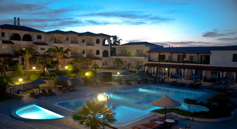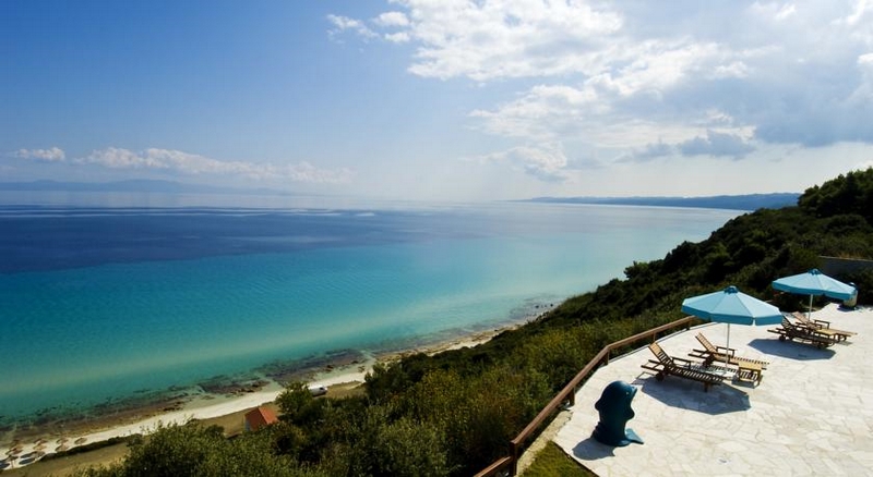 Hotel Blue Bay je smešten iznad plaže, na litici visine 60 metara. Poseduje 2 otvorena bazena nepravilnog oblika iz kojih se pruža pogled na Toronski zaliv i terasu za sunčanje opremljenu ležaljkama i suncobranima. U ponudi ima sobe iz kojih se pruža panoramski pogled na more. Sobe su ukusno uređene kombinacijom tradicionalnih elemenata i modernog dizajna. Svaka poseduje klima-uređaj, grejanje, flat-screen TV i mali frižider. Pojedine uključuju mini Hi-Fi sistem. U hotelskom restoranu smeštenom na ivici litice, služe se doručak na bazi švedskog stola i večera.