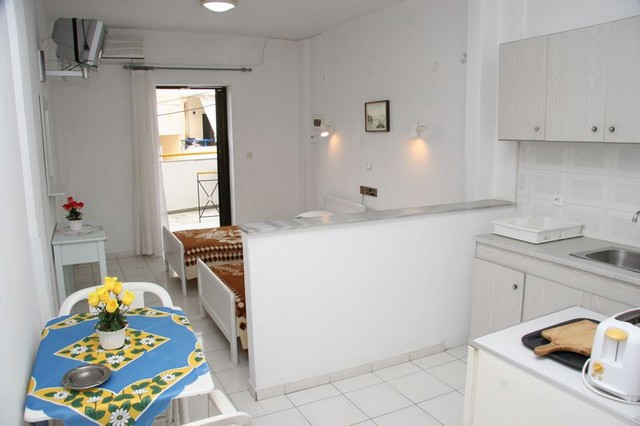 Vila Sarikas se nalazi u širem centru, na oko 400 metara od plaže, odnosno 6 minuta laganog hoda. U sklopu kompleksa se nalazi bazen koji gosti mogu koristiti svakodnevno u terminu od 08:30h do 20:00h kao i prostrano dvorište koje je idealno za druženje. Vila poseduje studije za 2 ili 3 osobe. Svaki studio ima kompletno opremljenu čajnu kuhinju sa osnovnim posuđem, TWC, TV, klima uređaj kao i balkon ili terasu. Svi studiji sa zadnje strane kompleksa se nalaze u prizemlju i imaju ulaznu terasu. Bežični internet nije uračunat u cenu aranžmana i plaća se na licu mesta 2 eura za 10 dana. Posteljina i peškiri se menjaju svakih 5 dana. Klima je uračunata u cenu u maju, junu i septembru, dok se u julu i avgustu naplaćuje na licu mesta 5 eura dnevno.