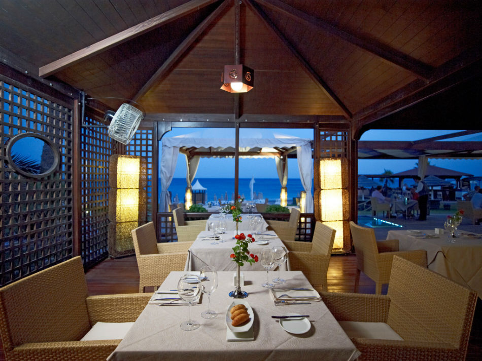 Hotelski sadržaj: sopstvena peščana plaža, restoran, taverna, kafeterija u hotelu, bar – restoran na bazenu, restoran na plaži, veliki bazen neobičnog oblika sa ležaljkama i suncobranima, dečji bazen, igralište, video igre i animacija za decu, 2 teniska terena, igralište za odbojku, košarku, mini golf i stoni tenis. Wellness i Spa centar. Wi-Fi internet u hotelskom lobiju. Prodavnica suvenira, nakita, kozmetike, kože i mini market.