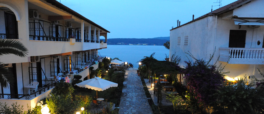 Lokacija: Hotel se nalazi na malom ostrvu Amuliani, do kog se stiže trajektom iz luke Tripiti. Udaljen je oko 30 m od plaže, do koje se može doći stepeništem, a 300 m od same luke, 120km od aerodroma.