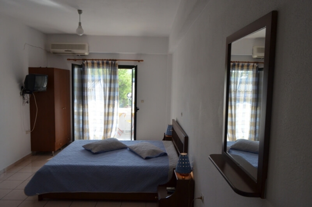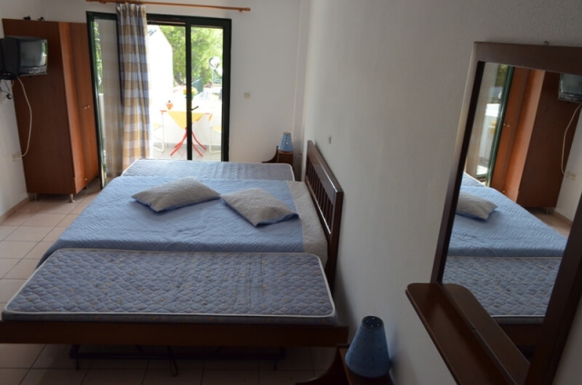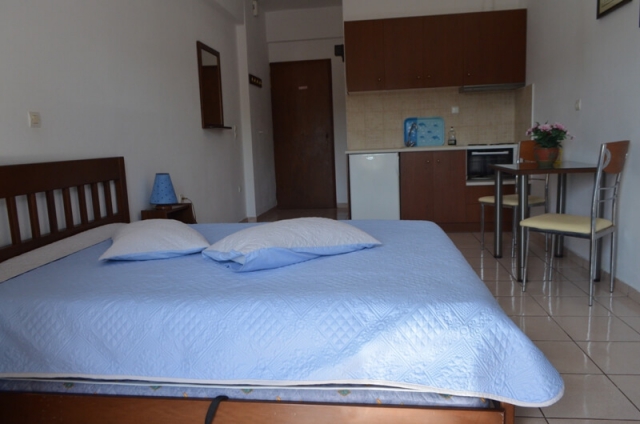 Vila Melikari se nalazi na samom šetališu Pefkija, na samo 20 metara od plaže. Od plaže je deli samo šetalište i ulica. Vila je okružena prostranim dvorištem sa zelenilom u kome se nalaze garniture za sedenje. U sklopu dvorišta ima roštilj koji mogu da koriste gosti vile i prostorija za poslednji dan boravka gostiju. Deo soba ima pogled na more, dok pojedine sobe gledaju ka dvorištu. Studiji su skromnijeg izgleda, nalaze se na spuštenom prizemlju, prvom i drugom spratu. Vila poseduje dvokrevetne stidije sa jednim ili dva pomoćna kreveta kao i trokrevetne studije sa pomoćnim krevetom. Svaki studio je opremljen kupatilom, kuhinjom (frižider, mini električni šporet, posuđe), terasom sa garniturom za sedenje, WiFi (slabog protoka) i klima uređajem čije je korišćenje uključeno u cenu najma. Terase su zaštićene tendama. Čišćenje je jednom u toku smene, dok je promena posteljine i peškira na 5 dana.