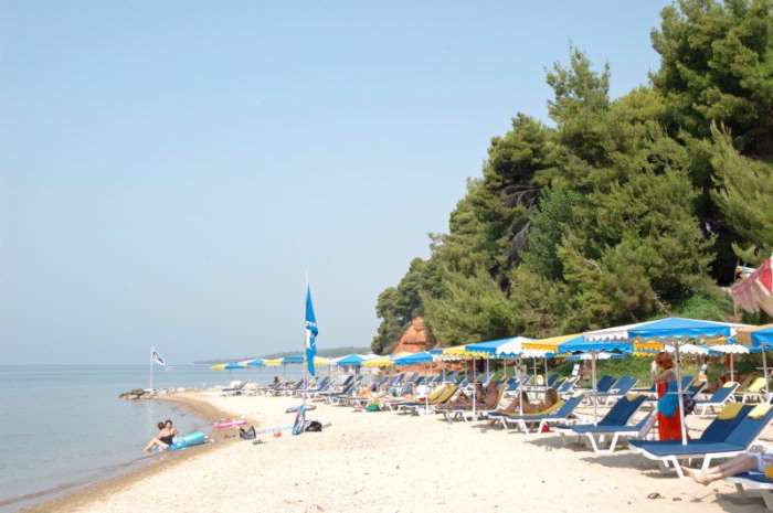 Mali porodični hotel Loutra Beach (22 sobe), nalazi se u centru ovog interesantnog i lepog letovališta. Od gradske plaže je udaljen tridesetak metara, a od Spa centra sa prirodno grejanim bazenima oko 800 metara. Skoro na kraju poluostrva, okrenuta prema Olimpu, Lutra je poznata po svojim termalnim, lekovitim izvorima, ali i po izvanrednim ribljim tavernama. Loutra Beach je udaljen od Soluna oko 100 kilometara i poznata je kao banja u blizini planinskog sela Agia Paraskevi (3 kilometra) i Pefkohorija (10 kilometara). Klima je izuzetno prijatna zahvaljujući kombinaciji velikih površina borove šume, kristalno bistrog mora i vetrova sa pučine. Gradić pruža sve mogućnosti za prijatan i lep odmor, naročito za porodice i starije. Hotel ima recepciju sa lobijem, sefove na recepciji (uračunati u cenu), restoran, bar, besplatan pristup Internetu u javnim delovima hotela, TV salu, teretanu, saunu i tursko kupatilo (sve uz doplatu na licu mesta) i parking. Sve sobe imaju telefon, A/C, TV, frižider, krevetac (na upit, bez doplate), fen za kosu, kupatilo i terasu/balkon. Standardne sobe su veličine cca 21 kvm i namenjene su za 2-4 osobe (2 standardna ležaja ili "francuski ležaj" i sofa). Usluga u hotelu Loutra Beach je noćenje sa doručkom ili polupansion – “švedski sto” (samoposluživanje).
