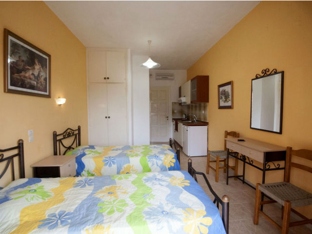 Nalazi se na oko 250 metara od plaže i na oko 350 metara od centra Ipsosa. Vila Eleni je odlična kuća, novijeg datuma, sa velikim bazenom. Raspolaže dvokrevetnim studijima i dvokrevetnim studijima sa pomoćnim ležajem. Pomoćni ležaj je istih dimenzija kao i osnovni ležaj. Sve smeštajne jedinice imaju kompletno opremljenu čajnu kuhinju, kupatilo (tuš/WC), TV i balkon. Svaka smeštajna jedinica imaju klima-uređaj, čije se korišćenje doplaćuje na licu mesta (5 € dnevno po studiju). Ova doplata nije obavezna. Vila je opremljena peškirima, kao i besplatnom WI-FI internet konekcijom.