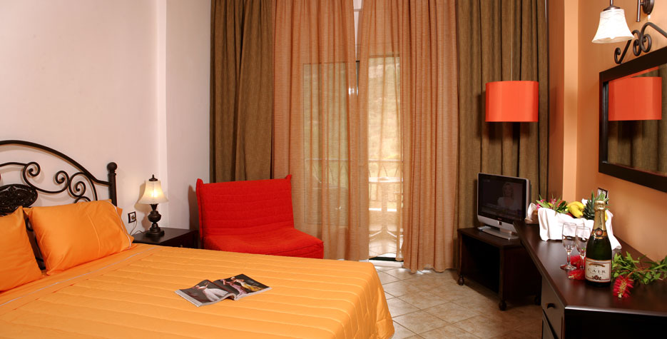 Peškiri za bazen se iznajmljuju uz depozit od 20 eur. Svi tipovi smeštaja imaju A/C, telefon, radio, SAT TV, mini bar, krevetac (na upit, uz doplatu na licu mesta), terasu i TWC sa fenom. Standardne sobe su veličine cca 21 kvm i namenjene su za 2-3 osobe ("francuski" ležaj i pomoćni ležaj). Superior sobe (renovirane 2016. godine) su veličine cca 28 kvm i namenjene su za 2-4 osobe ("francuski" ležaj i 1 ili 2 sofe). Family suite su veličine cca 52 kvm, namenjeni su za 2-5 osoba i sastoje se iz spavaće sobe ("francuski" ležaj") i dnevnog boravka (sofa na rasklapanje). Family suite imaju 2 klima uredjaja, 2 TV-a i 2 kupatila. Suite sa izlazom na bazen (Armonia suite) se nalaze u zgradi oko bazena u laguna stilu. Veličine su cca 38 kvm, namenjeni su za 2-4 osobe i sastoje se iz spavaće sobe ("francuski" ležaj) i dnevnog boravka (sofa na rasklapanje) koji nisu odvojeni vratima. Imaju 2 klima uredjaja i 2 TV-a. Mezonete se nalaze u izdvojenom delu hotela (izgradjen 2006. godine). Sve su u opremljene u tradicionalnom-etno stilu, veličine su cca 75 kvm i namenjene su za 2-5 osoba. Sastoje se iz spavaće sobe ("francuski" ležaj), dnevnog boravka sa kaminom (sofa) i galerije (2 standardna ležaja). Imaju 2 TV-a (u spavaćoj sobi i dnevnom boravku), sef i wi-fi Internet (uz doplatu na licu mesta). Sve mezonete imaju natkrivenu verandu sa garniturom za sedenje i privatni parking. Nalaze kod bazena koji mogu da koriste samo gosti smešteni u mezonetama. Od dodatnih usluga, postoji mogućnost serviranja doručka u sobama, kao i besplatna večera u taverni "Aegean Flavours". Usluga u hotelu Athena Pallas Village je polupansion – “švedski sto” (samoposluživanje).