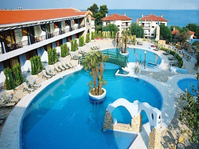 Renoviran (2006. g.) i sa dogradjenim novim, izuzetno luksuznim delom sa mezonetama, hotel u tradicionalnom, etno stilu, nalazi se na oko deset kilometara pre Neos Marmarasa, okružen borovom šumom, na samoj obali. Ima peščano – šljunkovitu, malu (usku) plažu koja je obasjana suncem od ranih prepodnevnih sati, pa do zalaska sunca, iza poluostrva Kasandra. Veličina plaže ispred vile je veoma promenljiva i može biti širine od pet do deset metara. Athena Pallas ima recepciju, menjačnicu, tri otvorena bazena, zatvoreni bazen, nekoliko dečjih, igralište i klub za decu, novoizgradjeni SPA (hamam, jacuzzi... - uz doplatu na licu mesta), dva restorana, šest barova, Internet "corner" (uz doplatu na licu mesta), wi-fi Internet u javnim delovima hotela (besplatno), prodavnicu, crkvicu, parking, sefove na recepciji, kongresnu salu, kombi prevoz do Neos Marmarasa i Nikitija, kao i niz sadržaja za zabavu i animaciju (etno muzej, teretanu, stoni tenis, bilijar, terene za tenis i odbojku, mini golf, sobu sa igricama, kuglanu - uz doplatu na licu mesta). Suncobrani i ležaljke oko bazena su uključeni u cenu, na plaži se doplaćuju oko 6 eur (set: 2 ležaljke i suncobran) za rezervacije na bazi polupansiona.