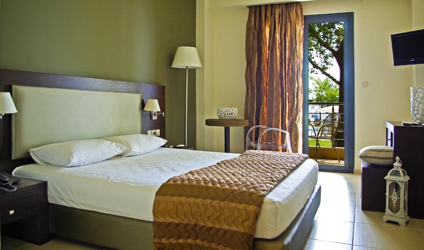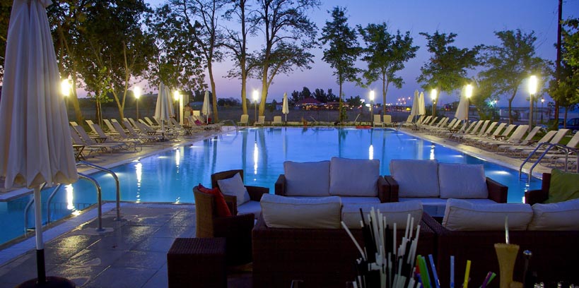 Hotel se nalazi izmedju Paralije i Olympic Beach-a (oko 500 metara pre ulaska u Olympic Beach) a od peščane plaže ga deli samo ulica. Sadržaj hotela: recepcija, sefovi na recepciji (uz doplatu na licu mesta), wifi internet u javnim delovima hotela (besplatno), restoran, bar, otvoreni bazen sa delom za decu, bar pored bazena, TV sala, parking… Suncobrani i ležaljke oko bazena su uključeni u cenu, a na plaži su na raspolaganju uz naručeno piće u baru. Sve sobe imaju TWC, mali frižider, TV, A/C, krevetac (na upit bez doplate) i terasu. Standardne sobe su veličine cca 20 kvm, namenjene su za 2-3 osobe (2 standardna ležaja ili "francuski ležaj" i pomoćni ležaj). Porodične (family) suite su veličine cca 40-45 kvm, namenjene su za 2-4 osobe i sastoje se iz spavaće sobe (2 standardna ležaja ili "francuski ležaj") i dnevnog boravka (sofa) koji nisu medjusobno odvojeni vratima. Usluga u hotelu je noćenje sa doručkom - “švedski sto” (samoposluživanje).