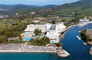 Veliki hotelski kompleks smeštem na četiri i po hiljade hektara i deset kilometara uz more, sa mnoštvom plaža i uvala. Izgradjen je pored Neos Marmarasa, sastoji se iz tri hotela i superluksuzne vile: Village Inn, Sithonia i Melitonom kao najluksuznijem medju njima. Pravi biser ovog kompleksa je vila bez premca po luksuzu, vila Galini (arhitektonsko rešenje po modelu svetogorskih manastira). Kompleks ima sopstvenu marinu (najveća u jugoistočnoj Evropi-može da primi do 315 plovila, duboka je 5.5 metara, dozvoljen je pristup jahtama dužine do 55 metara), ispred hotela veliku privatnu plažu dužine oko dva kilometra, sopstveni vinograd na skoro pedeset hektara, jednu od pet kockarnica u Grčkoj, najveći teren za golf u Grčkoj, jezero, dva na daleko poznata SPA sa bazenima sa grejanom morskom vodom (u SPA centrima nije dozvoljen boravak dece ispod 16 godina), heliodrom, kongresni centar sa četiri sale, pozorište, amfiteatar, bioskop, podrum najboljih vina sa vinotekom, uslove za bavljenje svim klasičnim i vodenim sportovima, a la cart restorane, kafiće, poslastičarnice, tržni centar, diskoteke i barove, ronilački, jahački i jedriličarski klub, dečja igrališta i klubove, otvorene i zatvorene bazene sa morskom i slatkom vodom, parkinge... U okviru celog kompleksa je dostupan wi-fi internet u javnim delovima hotela (besplatno). Suncobrani i ležaljke oko bazena i na plaži su uključeni u cenu. Peškiri za bazen se iznajmljuju uz depozit. Kompleks je povezan sa Neos Marmarasom taxi brodićem, a hoteli i sadržaji unutar kompleksa vozićem. Porto Carras je jedno od najelitnijih i najmondenskijih letovališta ne samo Grčke, već i Evrope, uvek u centru zbivanja grčkog džet seta. Jedan od godišnjih samita Evropske unije, na ministarskom nivou, održan je baš u hotelima Porto Carras-a. Svi navedeni sadržaji (sportski tereni, SPA centri, klubovi za decu, a la carte restorani...) su dostupni gostima uz doplatu na licu mesta.
